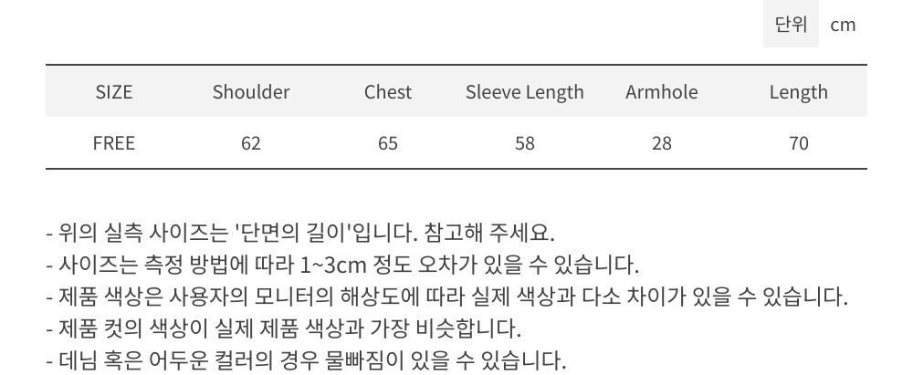 肩寬 62/胸寬 65/袖長 58/袖窿(液下)28/衣長 70